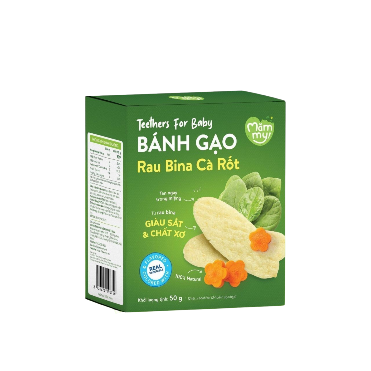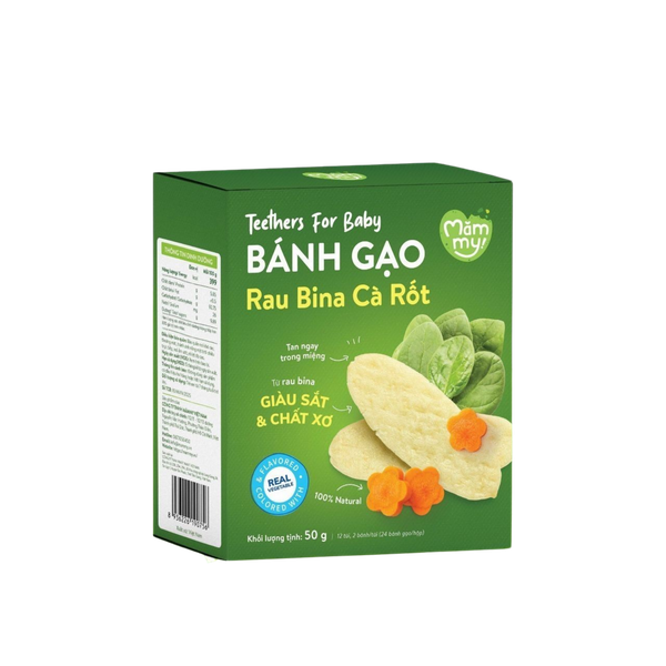 Bánh gạo rau củ Mămmy được làm từ gạo và rau củ tươi, sau đó sấy giòn ở nhiệt độ thấp. Không chiên, không chất bảo quản. Quy trình khép kín, kiểm tra nghiêm ngặt, đảm bảo bánh giòn tan, an toàn cho bé từ 7 tháng.