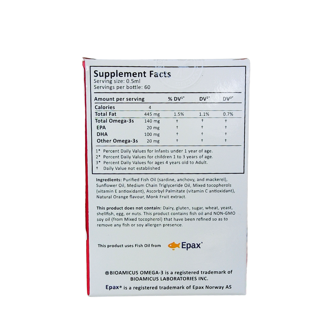 BioAmicus Omega-3 là sản phẩm chuyên biệt dành cho trẻ sơ sinh và trẻ nhỏ, bổ sung Omega-3 tự nhiên với tỷ lệ DHA và EPA hoàn hảo, giúp hỗ trợ sự phát triển não bộ, thị giác và hệ thần kinh. Được sản xuất tại Canada theo tiêu chuẩn quốc tế, sản phẩm phù hợp với trẻ từ 0 tháng tuổi, mang lại sự chăm sóc toàn diện ngay từ những năm tháng đầu đời.
