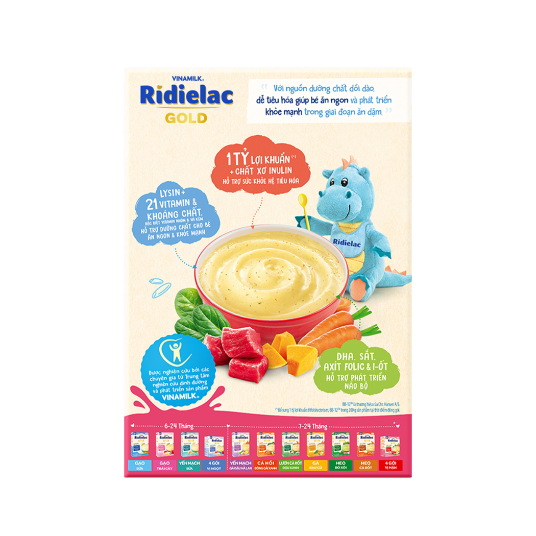 - Bên cạnh vị thịt bò rau củ, bột ăn dặm Ridielac Gold còn có nhiều hương vị khác ( heo cà rốt, heo cải bó xôi, gà rau củ,...)mang đến nhiều sự lựa chọn cho mẹ và bé.