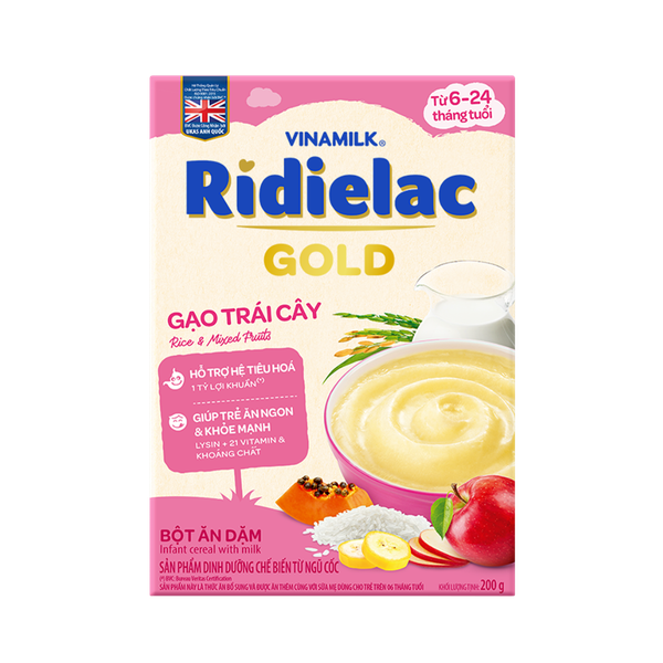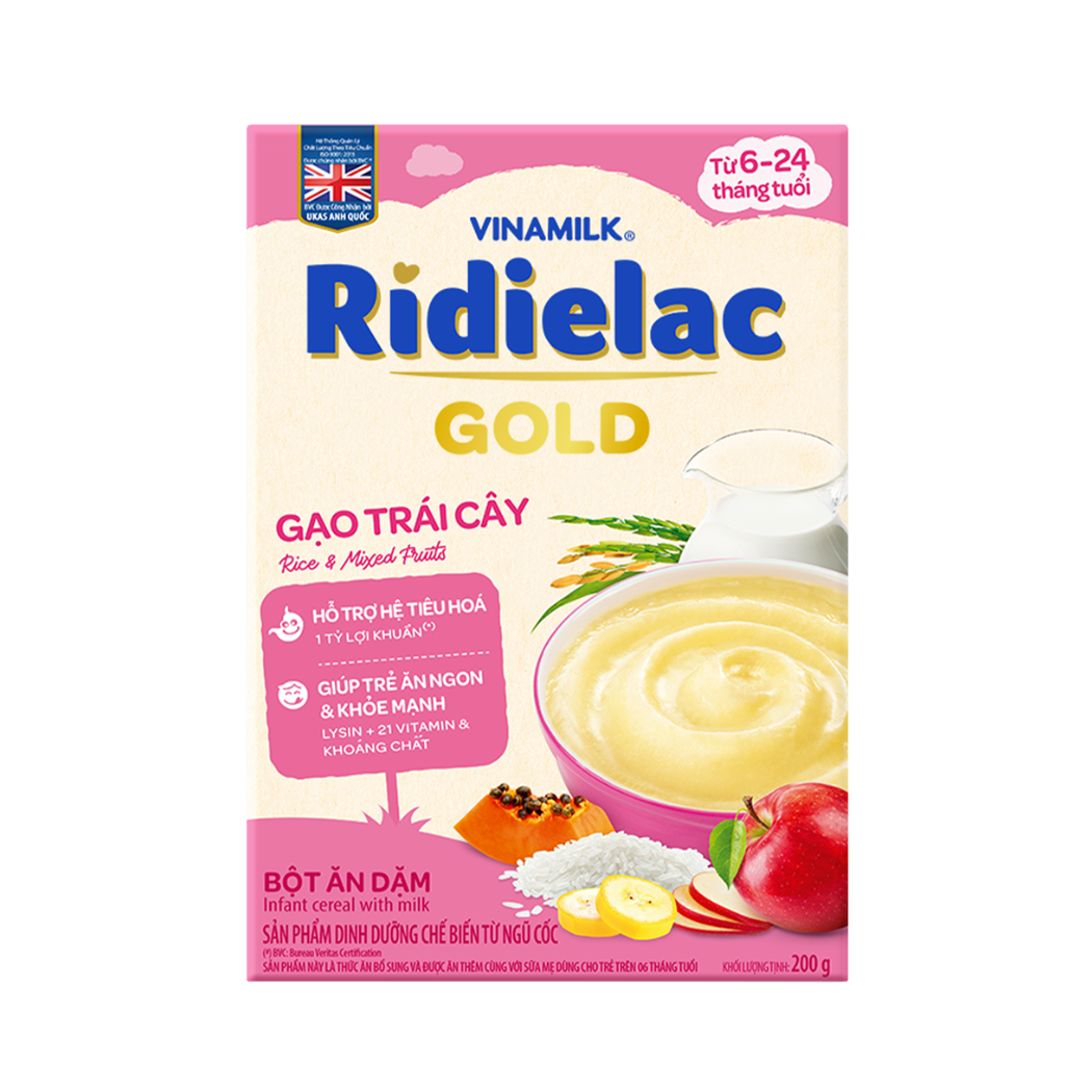 Bột ăn dặm Ridielac gạo trái cây được sản xuất trên dây chuyền công nghệ cao, đạt chất lượng theo tiêu chuẩn được công nhận bởi UKAS Anh Quốc. Tại thị trường Việt Nam hiện nay, bột ăn dặm Ridielac Gold chính là sự lựa chọn yên tâm và tin tưởng nhất cho các gia đình có con nhỏ đang trong giai đoạn ăn dặm.