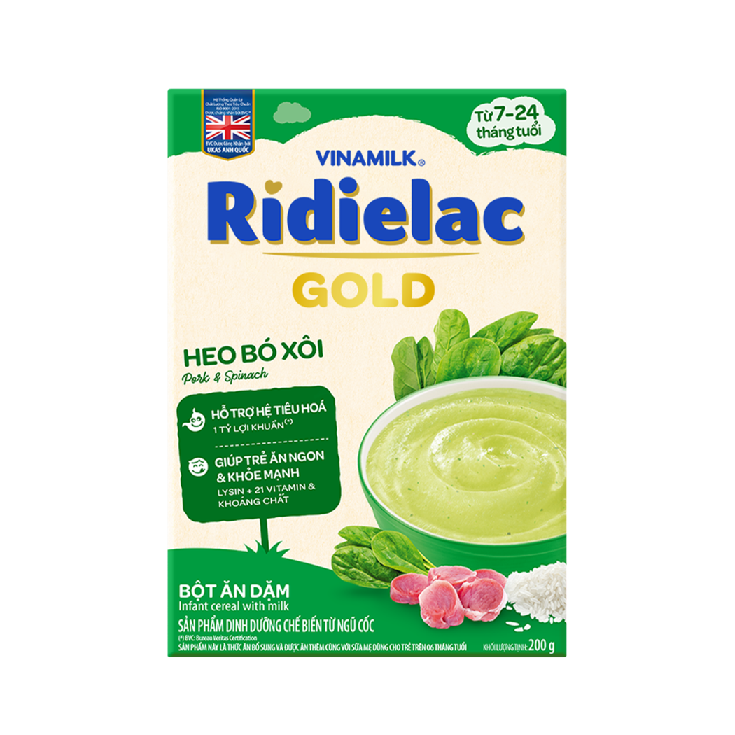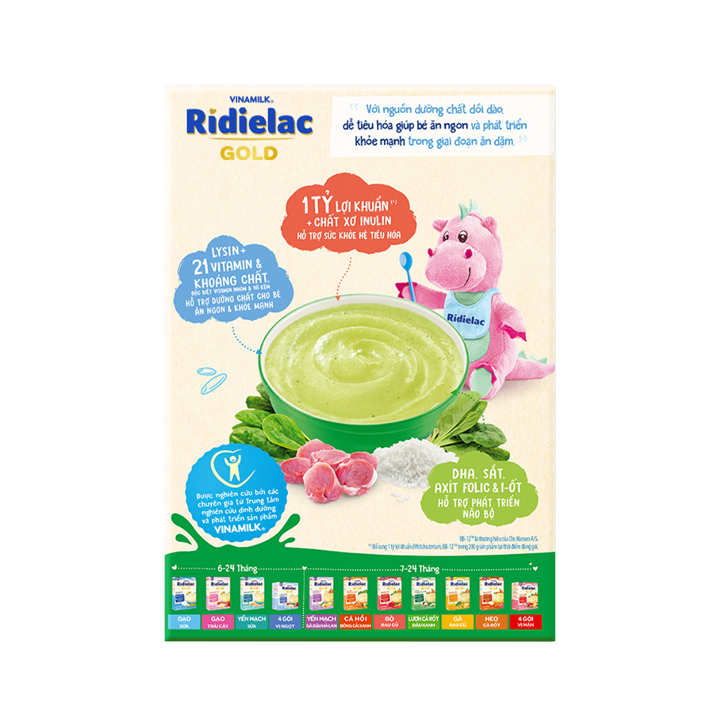 Bột ăn dặm Ridielac Gold vị heo bó xôi là thực phẩm giàu dinh dưỡng cho bé bắt đầu ăn dặm. Với hương vị thơm ngon, giàu đạm từ thịt heo và vi chất dinh dưỡng từ cải bó xôi. Bột ăn dặm Ridielac heo bó xôi giúp kích thích vị giác, bé ăn ngon miệng, phát triển thể chất toàn diện. Sản phẩm bổ sung DHA, Lutein hỗ trợ phát triển trí não và võng mạc. Chất xơ hòa tan hỗ trợ tiêu hóa, tăng cường lợi khuẩn cho đường ruột, kết hợp cùng 21 loại Vitamin và khoáng chất cần thiết cho sự phát triển cả về thể chất lẫn trí tuệ của bé.