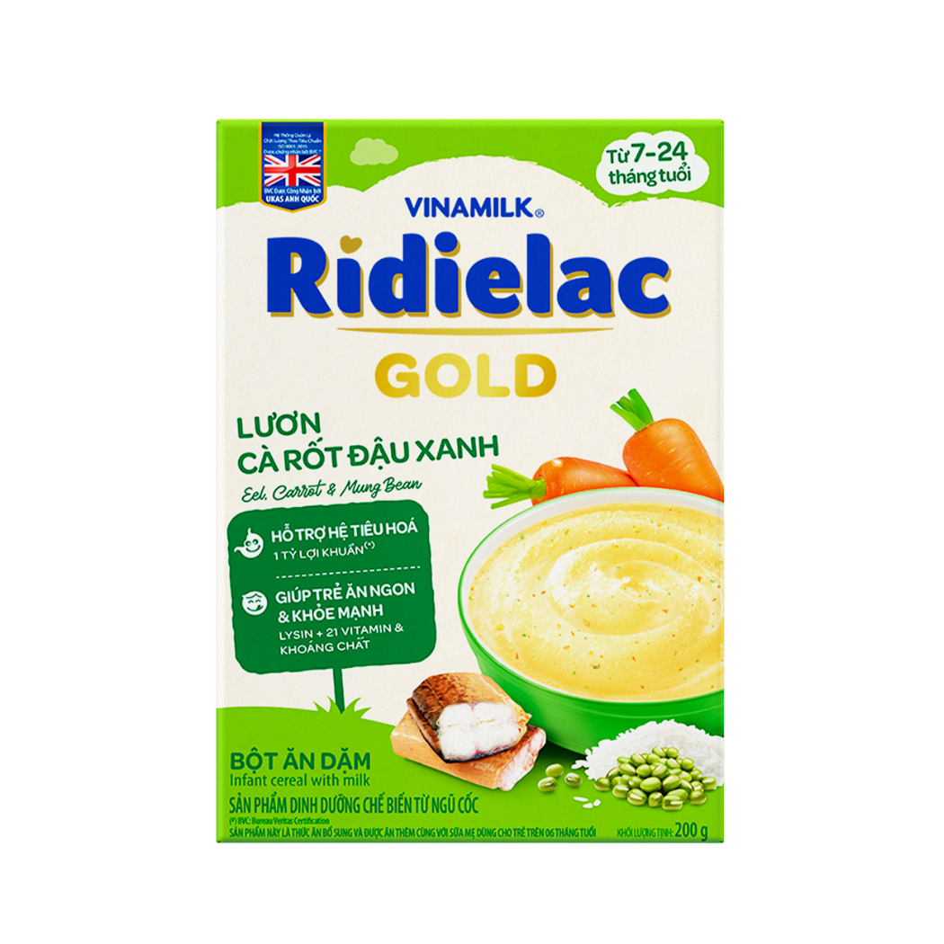 Thành phần và ưu điểm bột ăn dặm Ridielac Gold lươn cà rốt đậu xanh