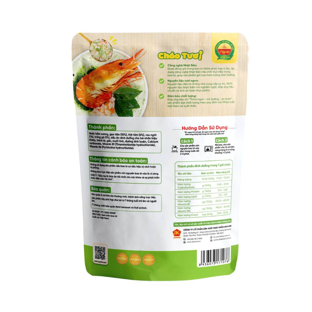 Thành phần: Nước xương hầm, gạo tấm (10%), thịt tôm (5%), rau ngót (1%), trứng gà (0,5%), xốt canxi vỏ trứng (0,3%), dầu đậu nành, muối, đường, hạt nêm, chất điều vị (621), vitamin nhóm B (B1, B6)