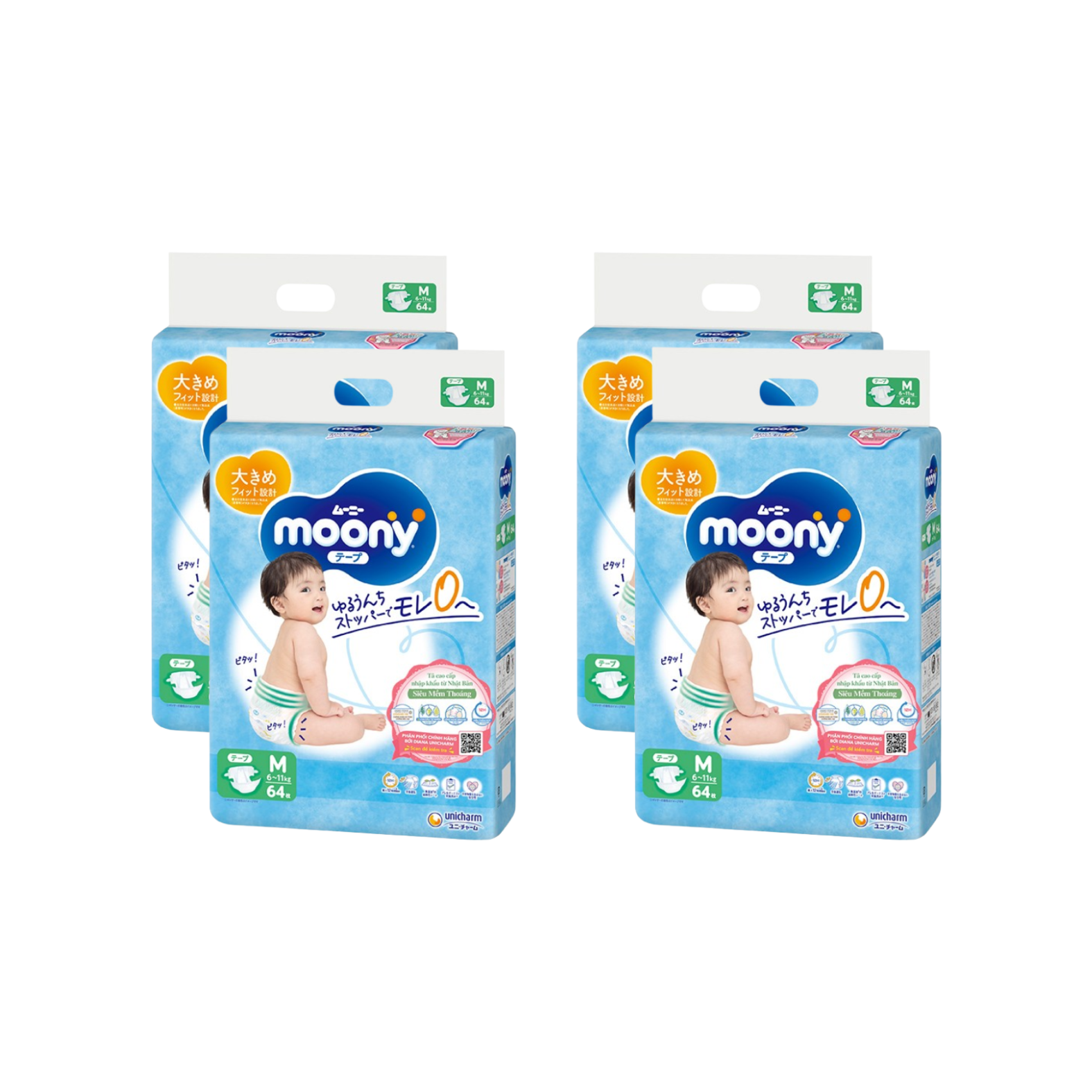 Combo 4 gói Tã Moony Xanh Dán M-64 (6 - 11 kg)