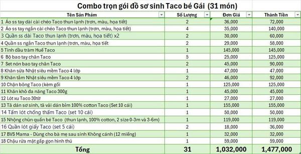 Combo trọn gói đồ sơ sinh Taco bé gái (31 món)