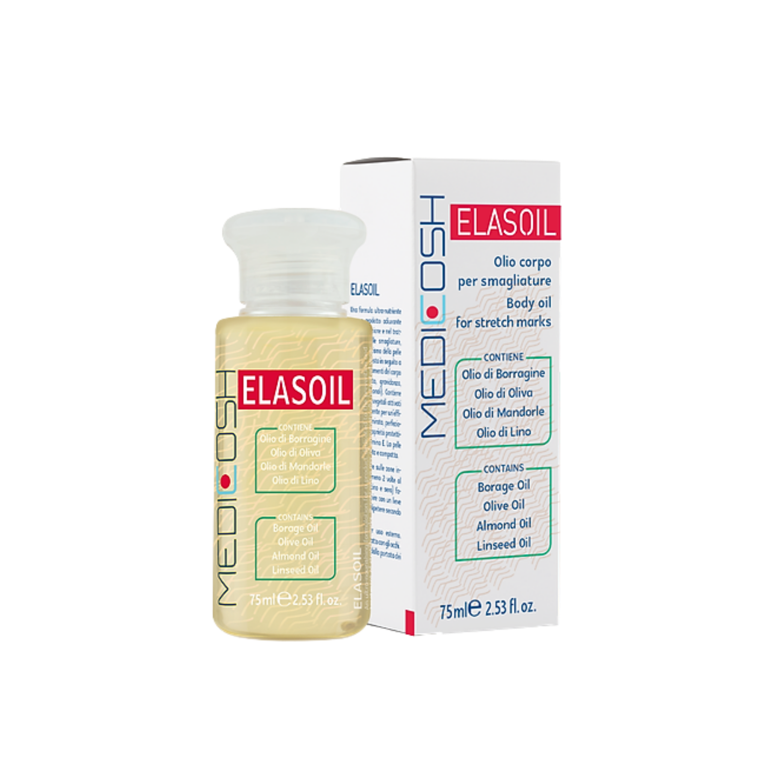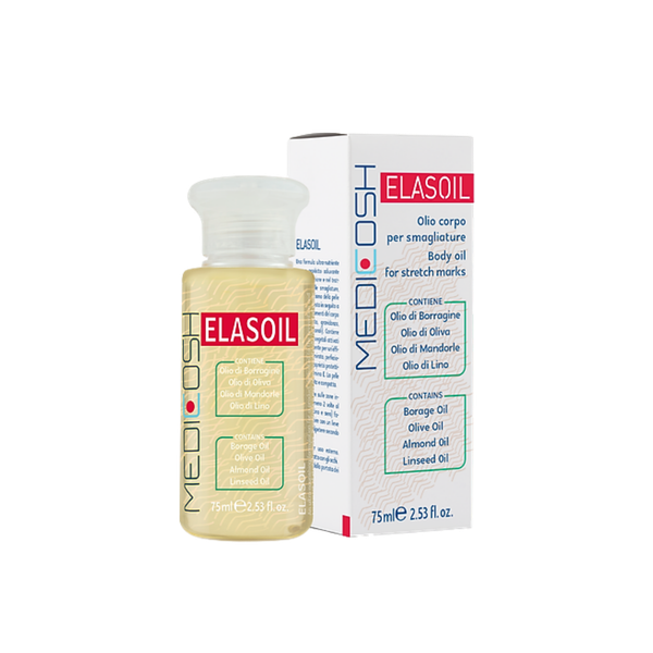 Elasoil là sản phẩm dầu dưỡng da chuyên biệt với công nghệ tiên tiến OLEOSOFT-4 hỗn hợp dầu thực vật kết hợp với các thành phần dầu Argan hữu cơ, α-bisabolol, vitamin E, vitamin A giúp tăng cường dưỡng ẩm, đều màu da và giảm vết rạn da, cải thiện tình trạng nhăn da, da bị lão hóa, da khô, da mất nước, da không đều màu. Sản phẩm được điều chế giúp cải thiện da hiệu quả, giúp da săn chắc và ngăn ngừa tình trạng rạn da, nhăn da, mang lại làn da mịn màng, khỏe đẹp.