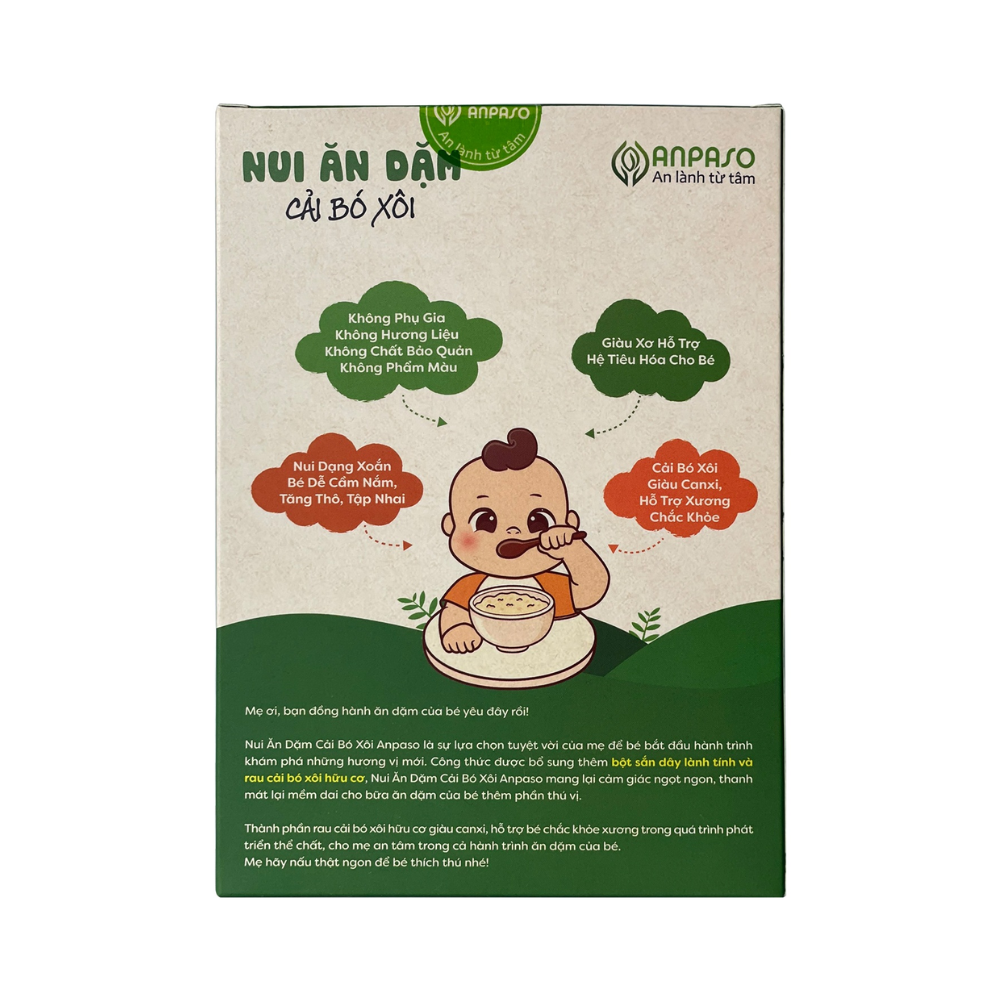 Nui ăn dặm cho bé Anpaso 150g cải bó xôi không chất bảo quản, không có muối, không gia vị, không phẩm màu, không chất phụ gia. Đây là đô ăn dặm giúp bé tập nhai, giàu chất xơ, dễ tiêu hóa. Cải bó xôi giàu canxi, hỗ trợ phát triển chắc khỏe xương cho bé.
