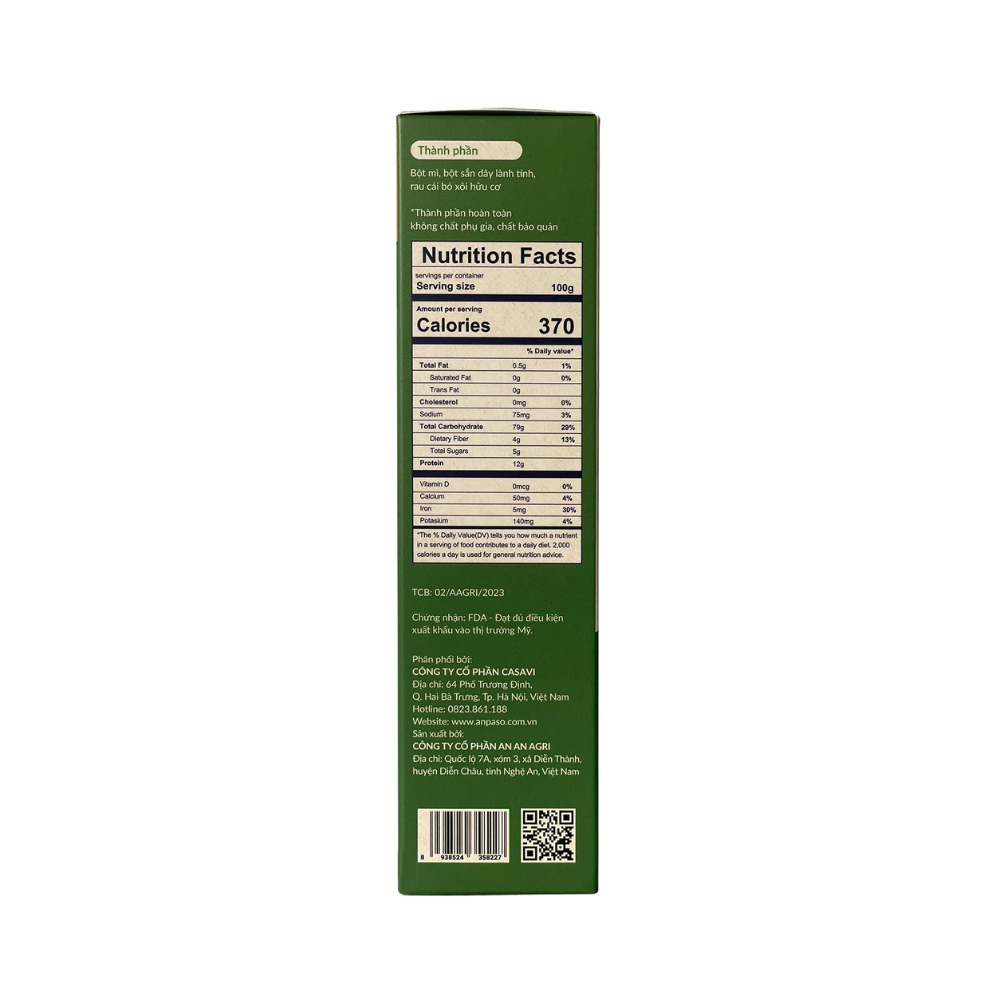 Thành phần: Bột mì, bột sắn dây lành tính, rau cải bó xôi hữu cơ