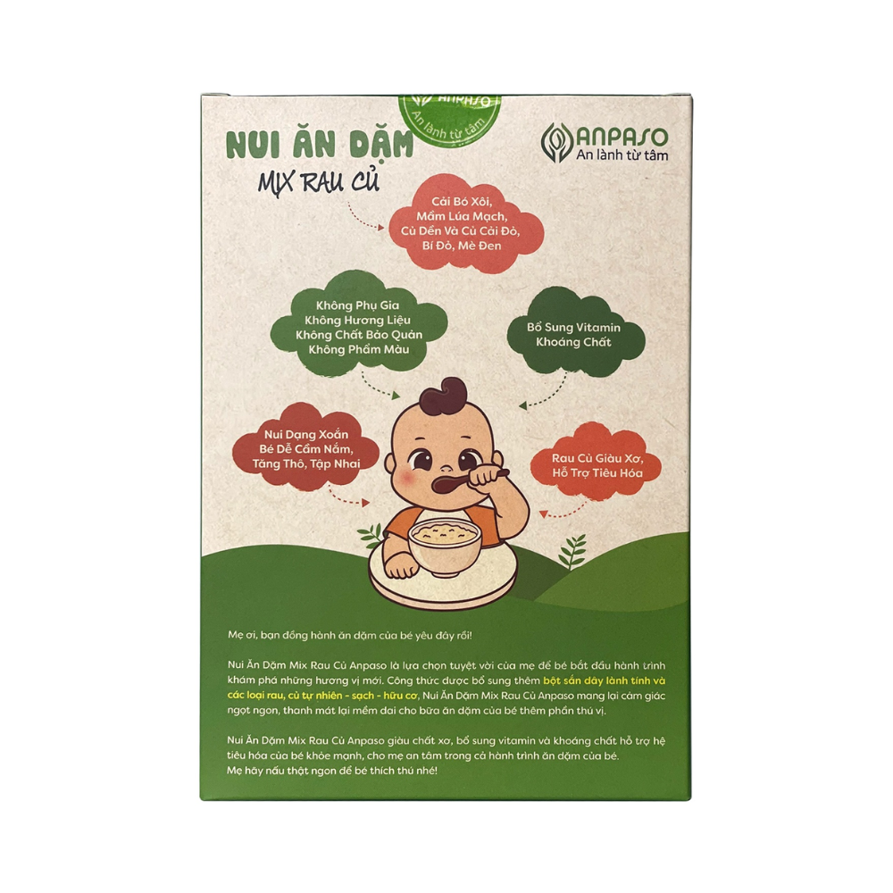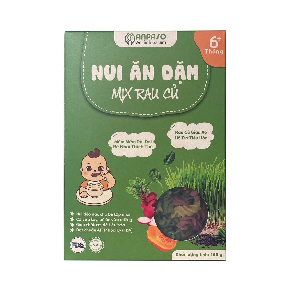 Nui ăn dặm cho bé Anpaso 150g mix rau củ không chất bảo quản, không có muối, không gia vị, không phẩm màu, không chất phụ gia. Nui Anpaso dẻo dai giúp bé tập nhai, giàu chất xơ, dễ tiêu hóa.