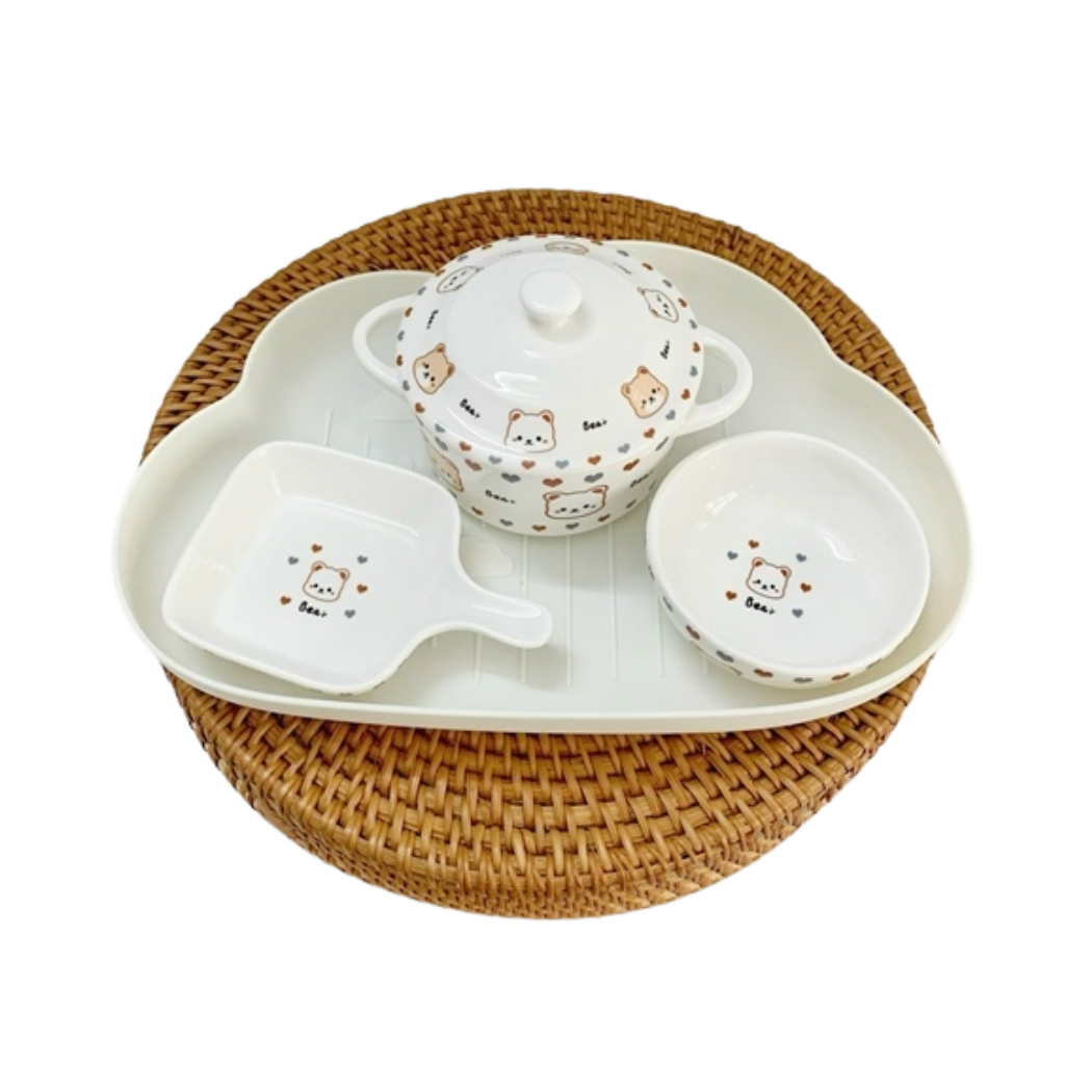 – Một bộ bát đĩa sứ ăn dặm Coco Bear bao gồm 4 sản phẩm: 01 đĩa vuông, 01 bát tròn nhỏ không tai, 01 bát (thố) có tai và nắp đậy, 01 bát tròn lớn có tai.