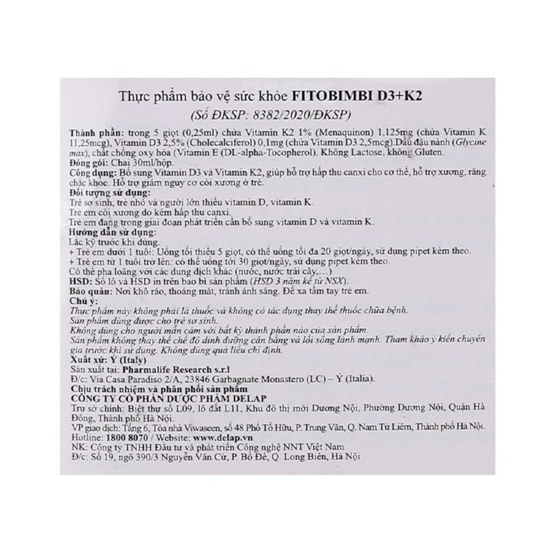 Thành phần chính Vitamin D3K2 Fitobimbi