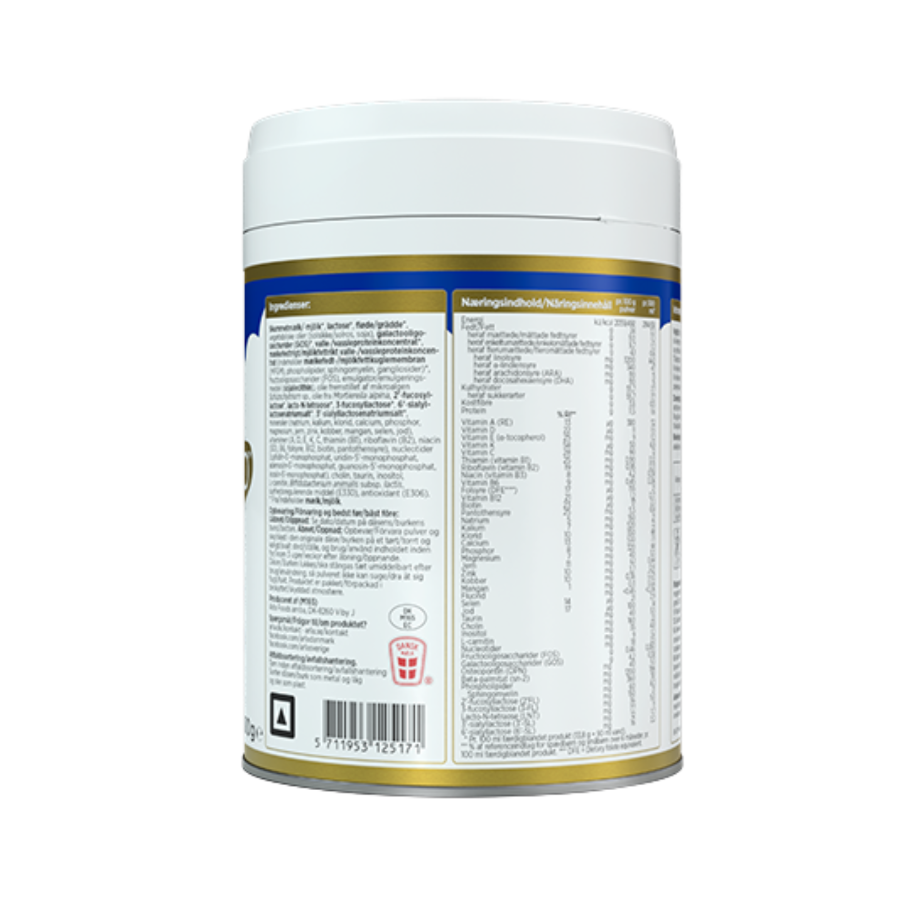 Sữa tách béo, lactose, kem, dầu thực vật (dầu hướng dương, dầu đậu nành), galactooligosaccharide (GOS), whey protein cô đặc (chứa màng cầu chất béo sữa (MFGM), phospholipid, sphingomyelin, gangliosid), whey protein cô đặc, fructooligosaccharide (FOS), chất nhũ hóa (lecithin đậu nành*), dầu chiết xuất từ vi tảo Schizochytrium sp., dầu từ nấm sợi Mortierella alpina, 2'-fucosyllactose, lacto-N-tetraose, 3-fucosyllactose, muối natri 6'-sialyl-lactose, muối natri 3'-sialyl-lactose. Khoáng chất (natri, kali, chloride, canxi, phospho, magiê, sắt, kẽm, đồng, mangan, selen, iod). Vitamin (A, D, E, K, C, thiamin (B1), riboflavin (B2), niacin (B3), B6, axit folic, B12, biotin, axit pantothenic), nucleotide (cytidin-5'-monophosphat, uridin-5'-monophosphat, adenosin-5'-monophosphat, guanosin-5'-monophosphat, inosin-5'-monophosphat), choline, taurine, inositol, L-phenylalanin, L-carnitin, Bifidobacterium animalis subsp. lactis, chất điều chỉnh độ axit (E330), chất chống oxy hóa (E306).