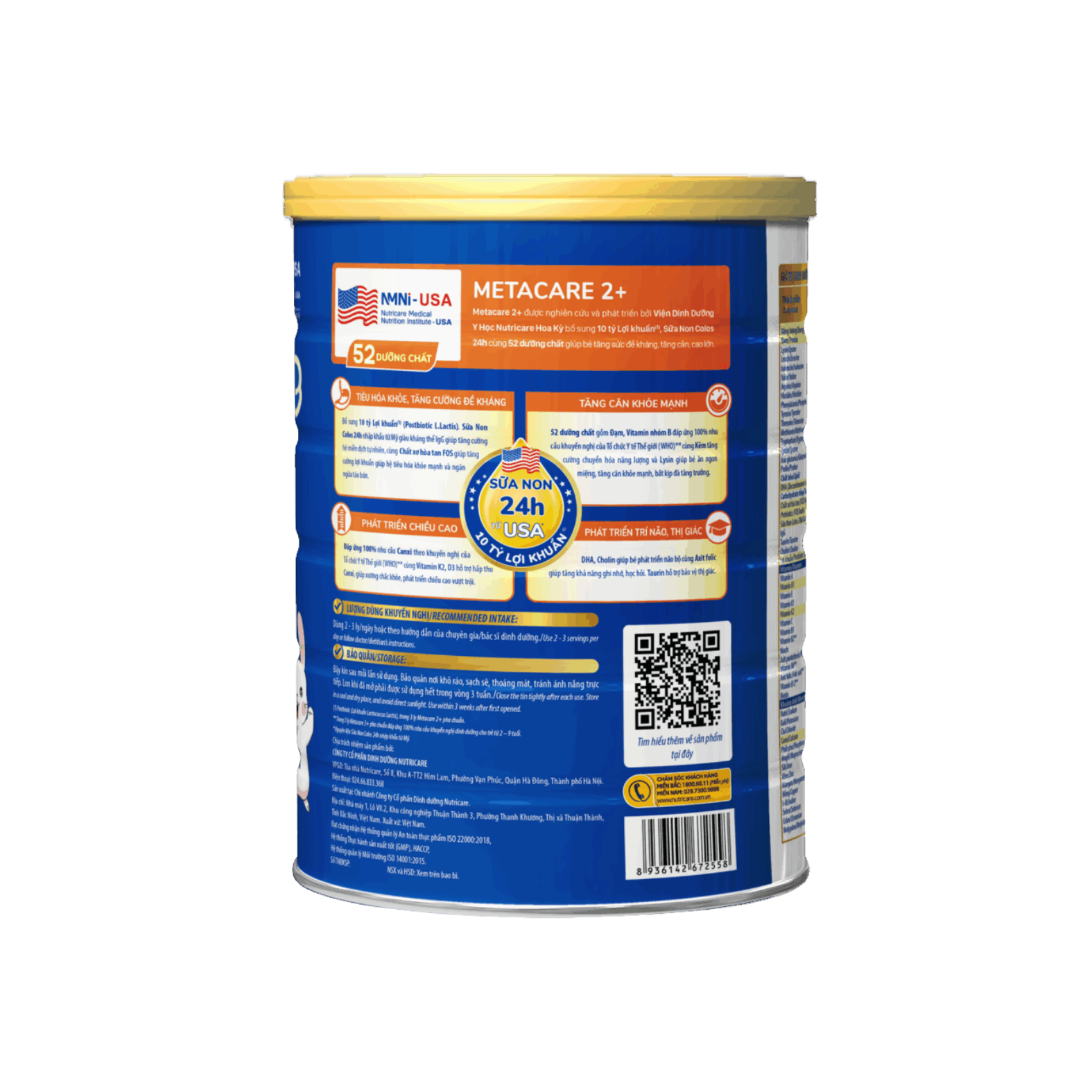 Sữa bột Metacare bổ sung 10 tỷ lợi khuẩn(1) (Postbiotic L.Lactis). Sữa Non Colos 24h nhập khẩu từ Mỹ giàu kháng thể IgG giúp đánh dấu virus, vi khuẩn gây bệnh để tế bào miễn dịch nhận diện và tiêu diệt, cùng chất xơ hòa tan FOS giúp tăng cường lợi khuẩn giúp hệ tiêu hóa khỏe mạnh và ngăn ngừa táo bón.