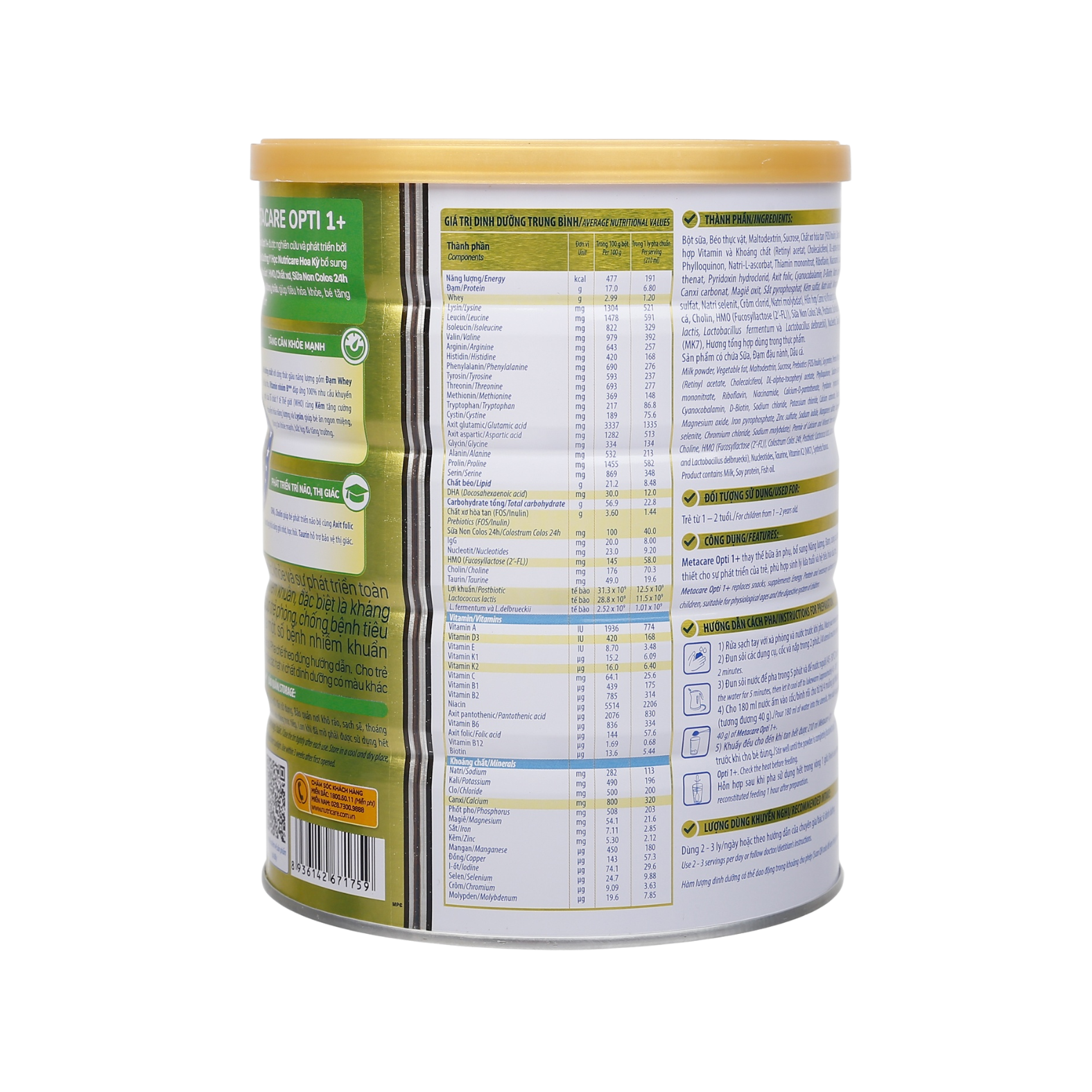 Thành phần sữa bột Metacare Opti 1+ 850g cho bé