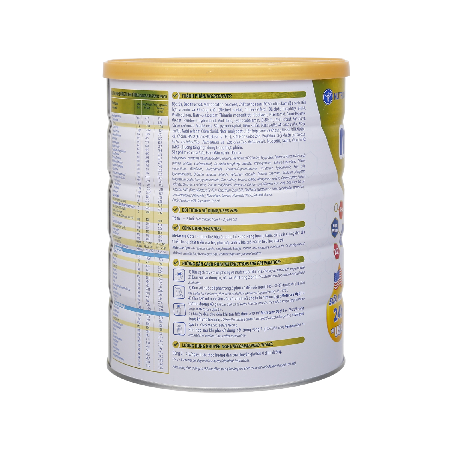 - Sữa Opti 1+ Metacare cung cấp 30 tỷ lợi khuẩn* (hệ lợi khuẩn Postbiotic L. Lactis và Postbiotic LBiome) ức chế sự phát triển của vi khuẩn có hại, tăng cường hệ miễn dịch tự nhiên cùng HMO kết hợp với chất xơ giúp hệ tiêu hóa khỏe mạnh, ngăn ngừa táo bón, hỗ trợ cân bằng vi sinh đường ruột. Cùng sữa non Colos 24h từ Mỹ giúp tăng cường sức đề kháng.