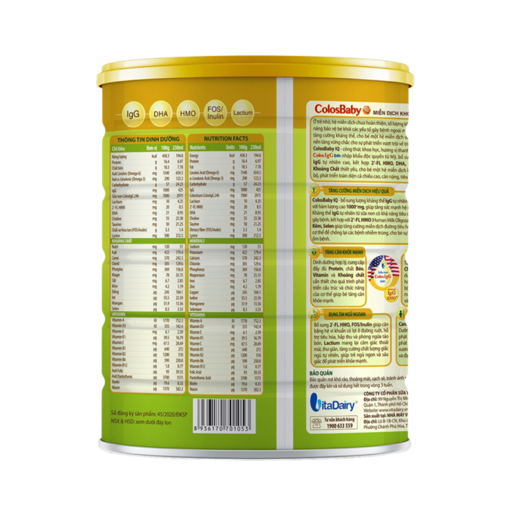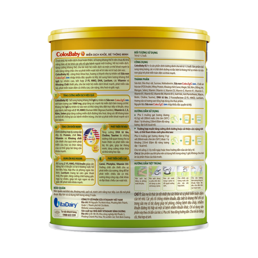 - Sữa bột Colosbaby IQ Gold 1+ 800g (1-2Y) là sản phẩm của VitaDairy là lựa chọn bổ sung miễn dịch và dinh dưỡng hợp lý cho mẹ và bé yêu