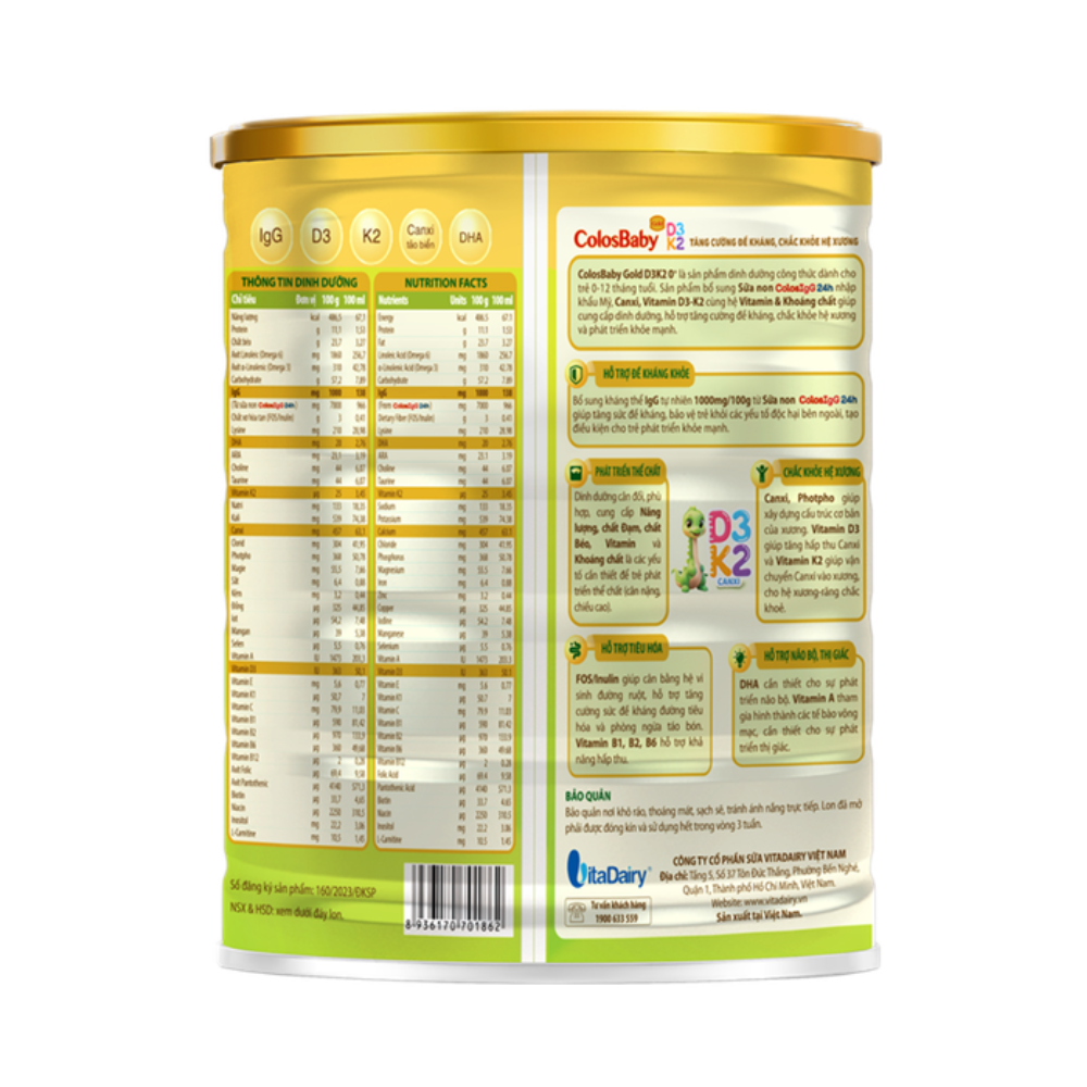 - Phát triển thể chất toàn diện: Sữa ColosBaby D3K2 cung cấp đầy đủ năng lượng, chất đạm, chất béo, vitamin và khoáng chất, giúp bé phát triển toàn diện về cân nặng và chiều cao.