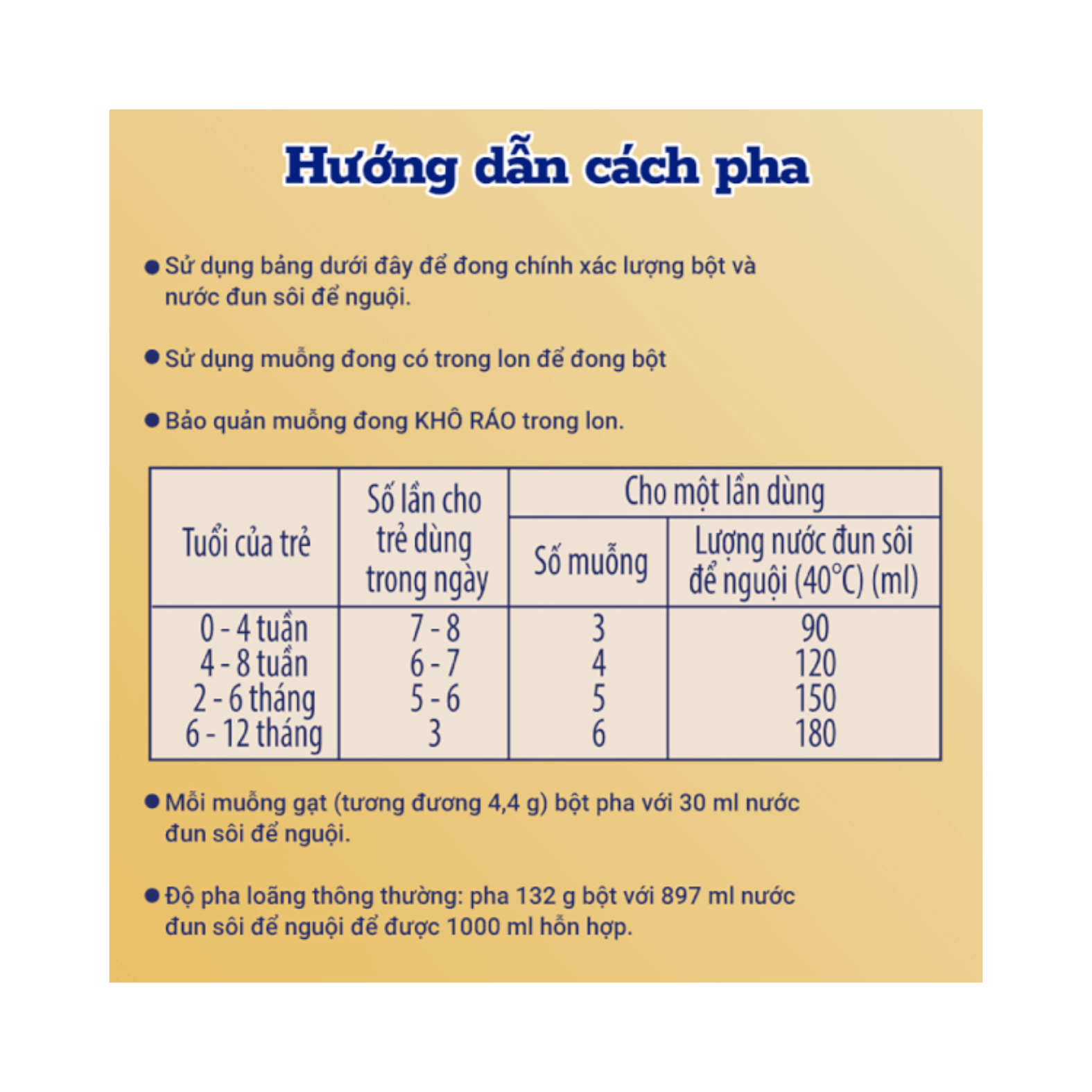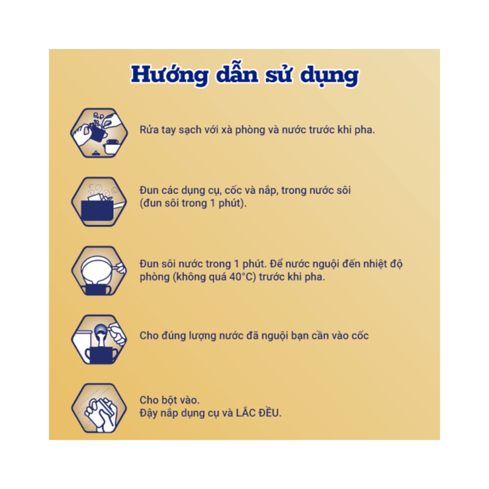 | Hướng dẫn sử dụng | Sức khỏe của trẻ tùy thuộc vào sự tuân thủ chặt chẽ các hướng dẫn sau đây: Vệ sinh, chuẩn bị dụng cụ, pha sản phẩm, sử dụng và bảo quản một cách thích hợp là rất quan trọng trong quá trình pha chế cho trẻ. Không nên dùng cho trẻ sinh thiếu tháng hoặc trẻ mắc các bệnh về hệ miễn dịch, trừ khi có sự chỉ định và giám sát của bác sĩ. Nên hỏi ý kiến bác sĩ để biết loại sản phẩm dinh dưỡng nào phù hợp với con bạn. Tham khảo ý kiến bác sĩ về sự cần thiết của việc pha sả¬n phẩm bằng nước đun sôi để nguội và đun sôi dụng cụ trước khi sử dụng. . Rửa tay sạch với xà phòng và nước trước khi pha. . Đun các dụng cụ, cốc và nắp, trong nước sôi (đun sôi trong 1 phút). . Đun sôi nước trong 1 phút. Để nước nguội đến nhiệt độ phòng (không quá 40°C) trước khi pha. Cho đúng lượng nước đã nguội bạn cần vào cốc. Cho bột vào. . Đậy nắp dụng cụ và LẮC ĐỀU. |