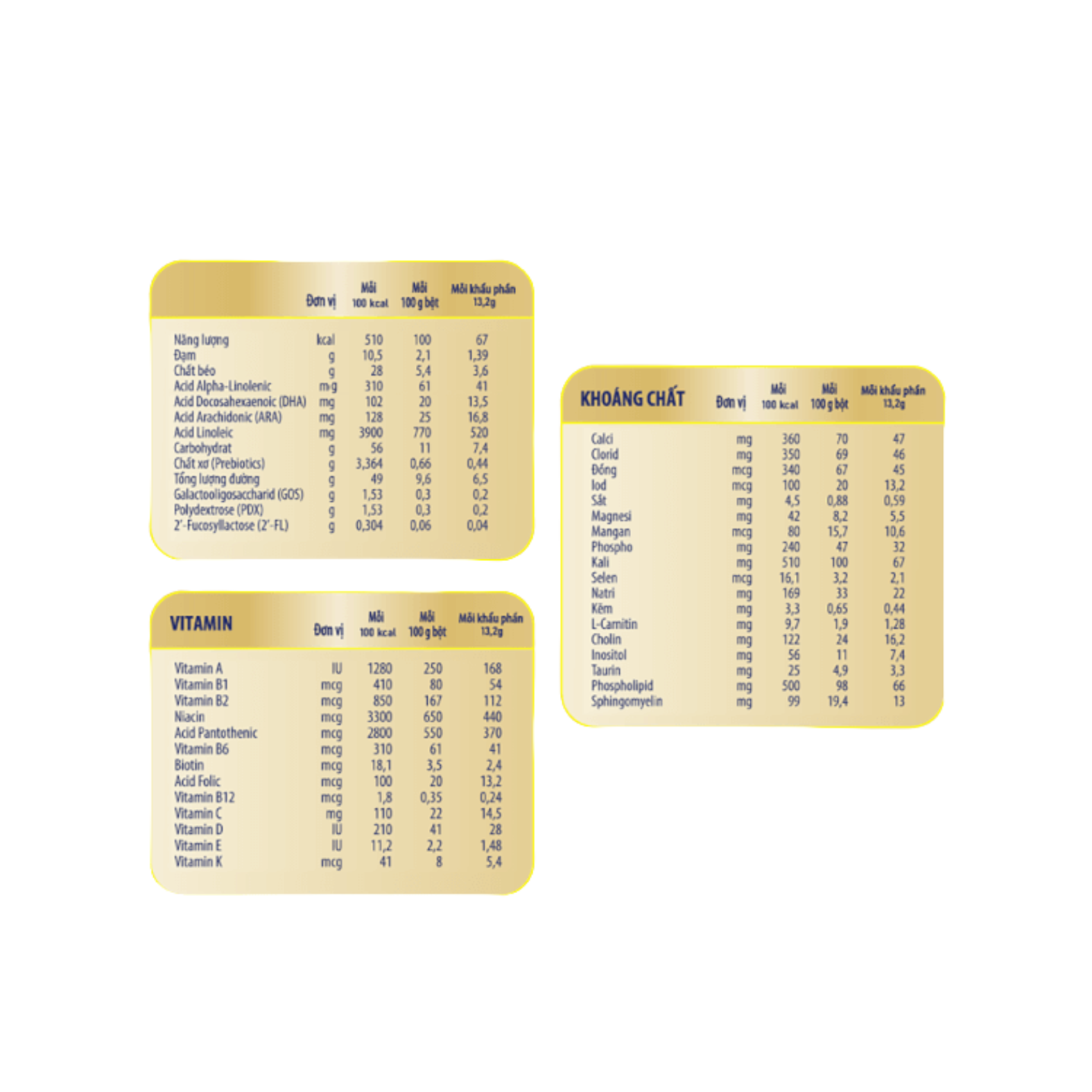 Lactose, dầu thực vật, sữa bột tách béo, đạm whey tinh chất (nguồn của MFGM; 7,3%), galactooligosaccharid, polydextrose, các khoáng chất (kali clorid, natri citrat, tricalci phosphat, calci carbonat, magnesi phosphat, kali hydroxyd, kali citrat, sắt sulphat, kẽm sulphat, đồng sulphat, mangan sulphat, natri iodid, và natri selenit), chất nhũ hóa (lecithin đậu nành), dầu đơn bào là nguồn của acid arachidonic (ARA) và acid docosahexaenoic (DHA), các vitamin (acid ascorbic, cholin clorid, alpha-tocopheryl acetat, retinyl palmitat, niacinamid, phytonadion, calci pantothenat, cholecalciferol, cyanocobalamin, riboflavin, thiamin hydroclorid, pyridoxin hydroclorid, acid folic và biotin), 2’-fucosyllactose, sirô mật bắp, inositol, taurin, L-carnitin, chất chống oxy hóa (ascorbyl palmitat).