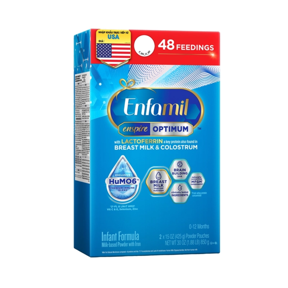 Sữa Enfamil Enspire Optimum (850g) là dòng sữa bột cao cấp nhập khẩu từ Mỹ, dành cho trẻ sơ sinh từ 0-12 tháng tuổi. Sữa không chứa thành phần biến đổi gen, mang lại nguồn dinh dưỡng tối ưu giúp bé phát triển toàn diện cả về thể chất và trí não. Sản phẩm chứa bộ đôi dưỡng chất vàng MFGM & DHA hỗ trợ sự phát triển não bộ, cùng với Lactoferrin và Dual Prebiotics (PDX & GOS) giúp tăng cường miễn dịch và hỗ trợ tiêu hóa khỏe mạnh cho bé.
