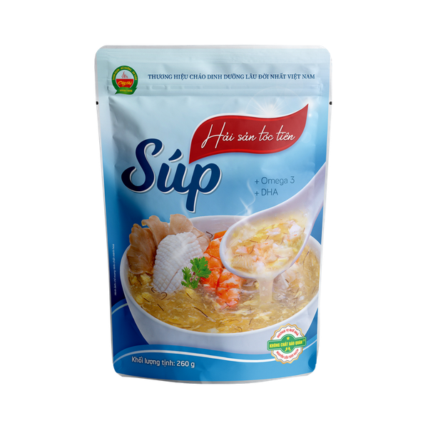 Thành phần: nước hầm xương, tôm (8%), mực (5%), nấm bào ngư (3%), trứng gà (2,5%), cà rốt (2%), bột năng (2%), tóc tiên (0,3%), thực phẩm bổ sung dầu ăn dinh dưỡng cho trẻ em nhãn hiệu Kiddy, muối tinh, đường tinh luyện, chất điều vị (INS 621), chất làm dày (INS 415).